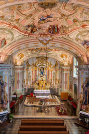Der gesamte Kircheninnenraum ist seit 1768 von Joseph Sattler und Sohn in Freskotechnik ausgemalt. Die Gesamtansicht ist eine prachtvolle Scheinarchitektur Einzigartig sind die bemerkenswert reichen Architekturprospekte auf den flachen Deckenkuppeln. Das Hauptbild zeigt König Salomons Weisheit und die Königin von Saba.